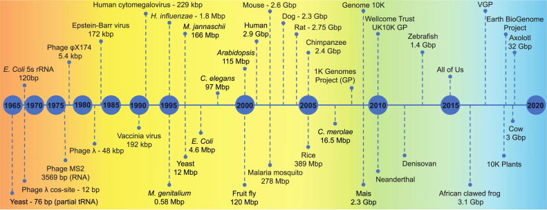 2000 - Myers et al. assemble the Drosophila melanogaster (fruit fly) genome (116 Mbp). The assemble was done with the WGS Assembly strategy and Celera Assembler software.