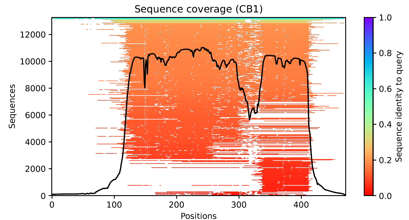 This example has a depth of ~13,000 sequences, with varying levels of homology to the query. The CB1 protein is a 7-transmembrane (7TM) helical protein with less-structured tails on both termini — which is also reflected in its 3D structure predictions.