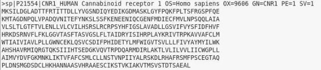 As an example, you can download a sequence from UniProt, such as P21554 (CNR1), which corresponds to the human Cannabinoid Receptor 1 (CNR1), a GPCR protein.