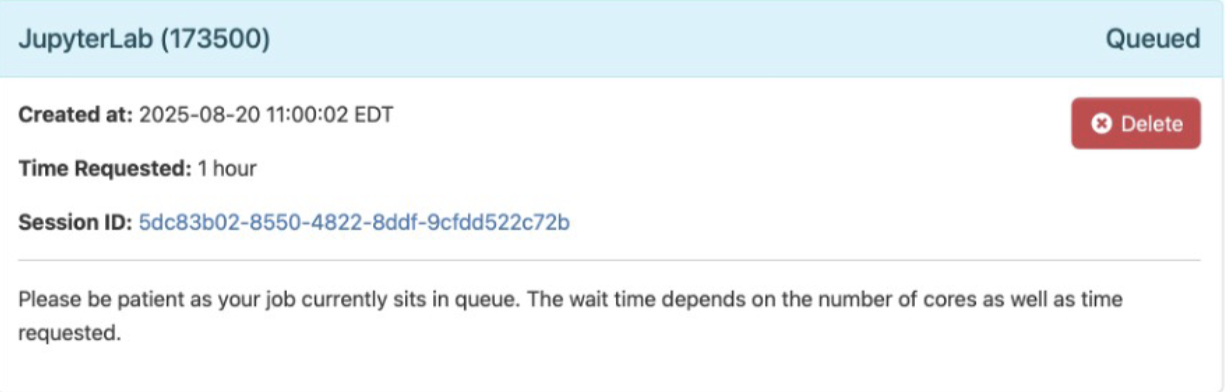 Once you’ve filled out the resource request form, click the Launch button at the bottom to queue your job. While queued, the job will wait for the resources you’ve asked for to become available. Requests with higher resource requests (more cores, more memory, more time) may wait longer.