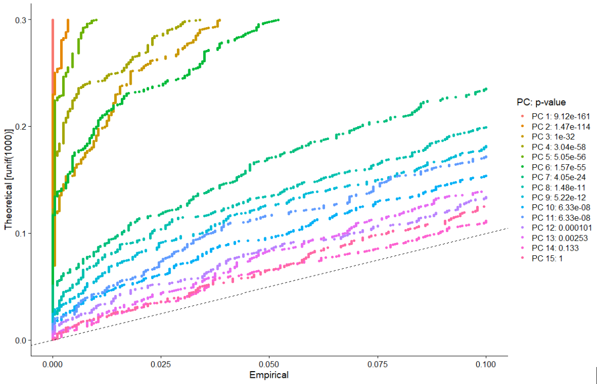 Compare the distribution of p-values for each PC with a uniform distribution (represented by the dashed line). “Significant” PCs show a strong enrichment of features with low p-values (curve above the dashed line).