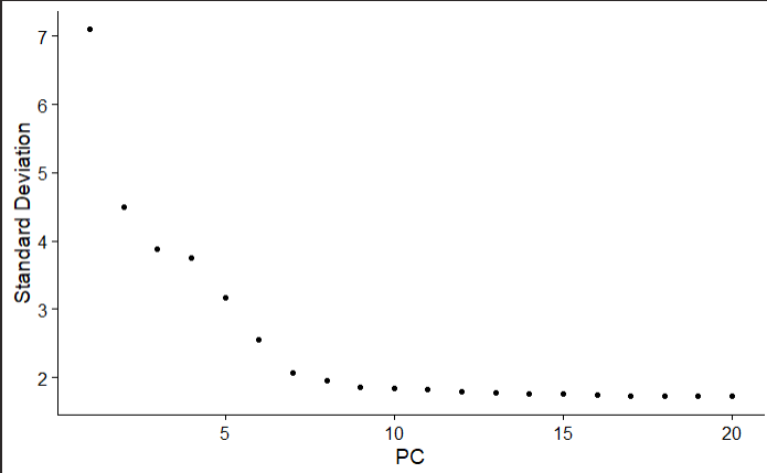 This ‘elbow’ starts at ~PC 7, and definitely flattens off by PC 10, so we will choose PC10 as our cutoff for significant PCs.