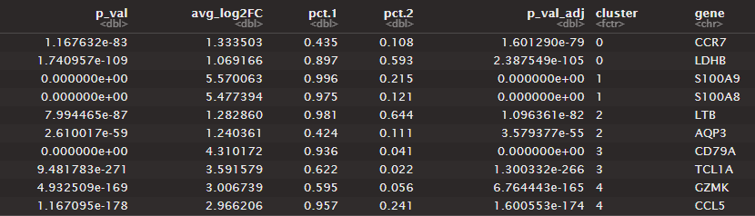 The table shows output from the last 3 lines of code. It finds markers for every cluster compared to all remaining cells, reports only the positive ones, and shows the top 2 for each cluster.