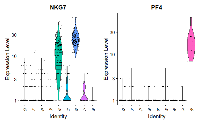 VlnPlot(pbmc, features = c("NKG7", "PF4"), slot = "counts", log = TRUE)