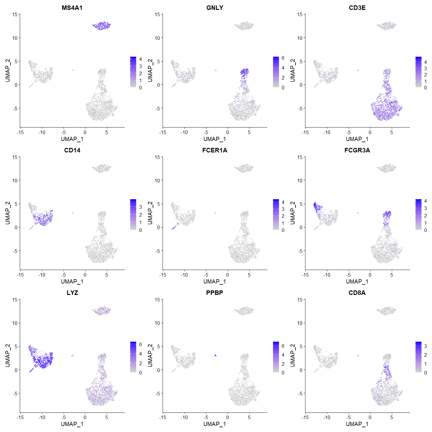 FeaturePlot(pbmc, features = c("MS4A1", "GNLY", "CD3E", "CD14", "FCER1A", "FCGR3A", "LYZ", "PPBP", "CD8A"))