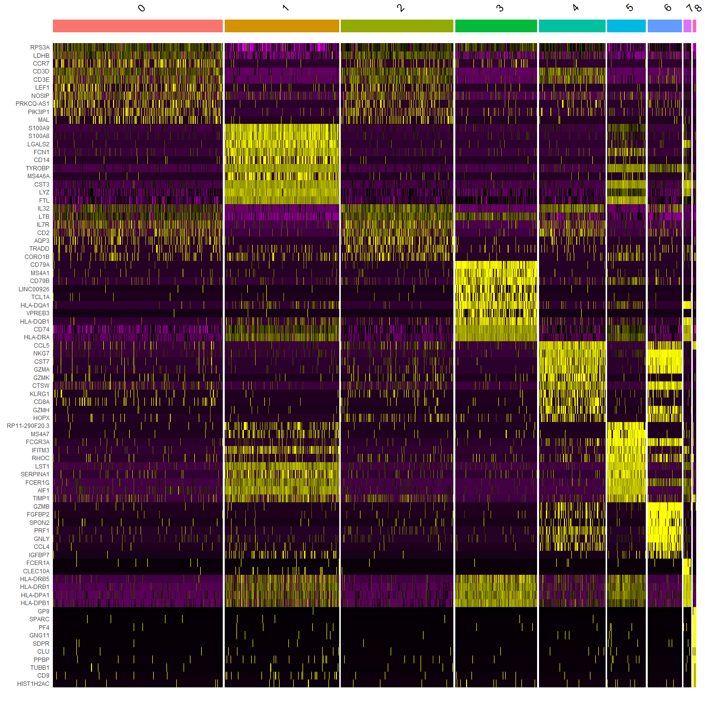 DoHeatmap(pbmc, features = top10$gene) + NoLegend()